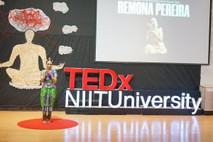Remona Pereira reflected on the challenges she faced as a young dancer navigating her journey, while also addressing the relatable emotions experienced by the younger generation. She followed her talk with a Bharatnatyam performance.